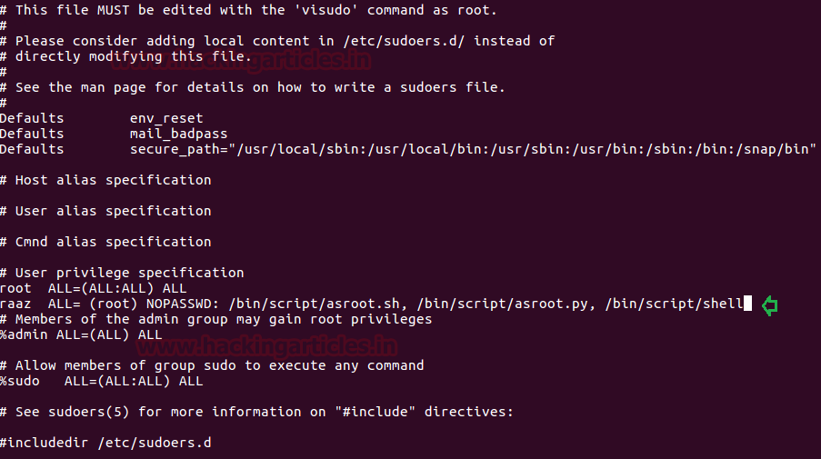 | 1 | raaz ALL= (root) NOPASSWD: /bin/script/asroot.sh, /bin/script/asroot.py, /bin/script/shell |