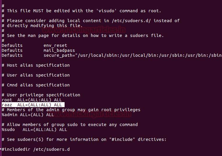 | 1234 | visudoraaz ALL=(ALL:ALL) ALLorraaz ALL=(ALL) ALL |
