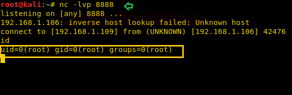 Since the tar command is running as root due to crontab, this has the effect of spawning a netcat shell and sending it to the attack platform on port 8888. And if you go back to the terminal window where the listener was on, you will have victim’s reverse connection in after 1 minute.