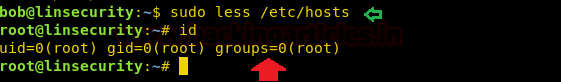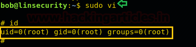 As we know it opens the file in vi mode and since you have run the command with sudo right which means we can get a shell through it. Execute !bash command inside hosts file as shown above and you will get a root shell.