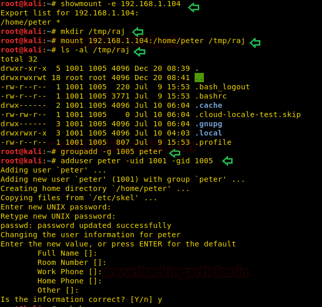 But I mount /home/peter in our /tmp/raj directory, I didn’t find anything here, truthfully when I try to create .ssh directory, it gave permission denied error, therefore, I create a fake peter account with a UID of 1001 on my Kali machine and successfully created .ssh folder as shown below steps.