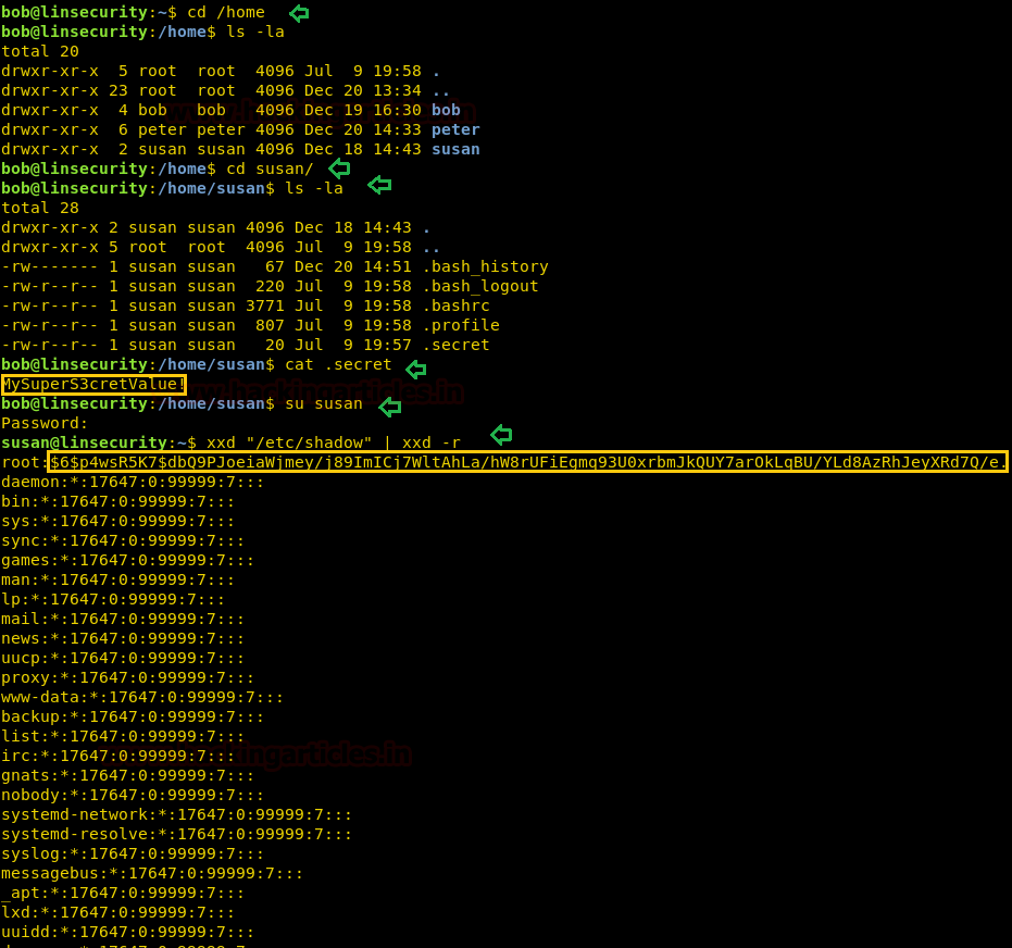 Let’s get into /home directory where we discover 3 users’ directory bob, susan, and peter. Since we have escalated root shell via bob in all possible way but now I’m curious in penetrating /susan directory. So while exploring /susan; I found password “MySuperS3cretValue!” from inside .secret