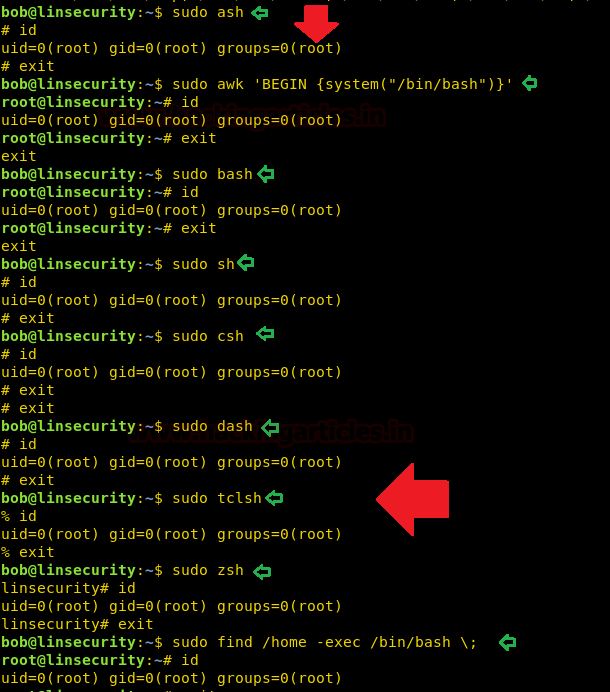 | 123456789 | sudo ashsudo awk ‘BEGIN {system(“/bin/bash”)}’sudo bashsudo shsudo cshsudo dashsudo tclshsudo zshfind /home -exec /bin/bash \; |