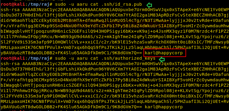 Further, I explored id _rsa.pub and authorized key where I noticed Karl@happycorp and realized that Karl could be the possible username for ssh login. Therefore, I used the id_rsa key for login into ssh as karl but failed to login into it, as it required a passphrase for the key.