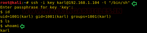 | 1 | ssh -i key karl@192.168.1.104 -t “/bin/sh” |