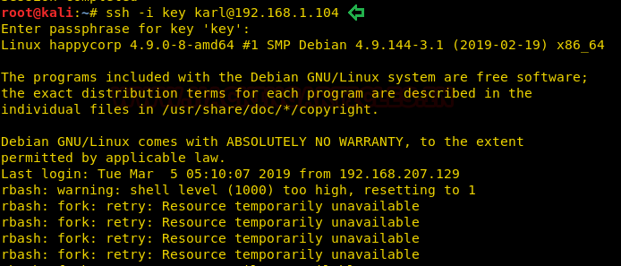 After obtaining the passphrase “sheep” we changed the permission of RSA key and login as karl but unfortunately, we got access of restricted shell also known rbash as a shell.