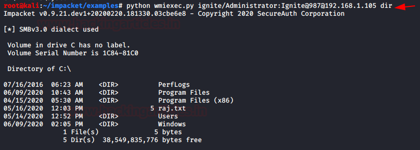 | 1 | python wmiexec.py ignite/administrator:Ignite@987@192.168.1.105 dir |
