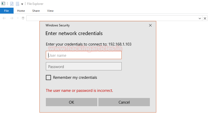 When the victim will try to access a shared folder, he will get trap into fake window security alert prompt, which will ask victims to enter his username and password for accessing shared folders.