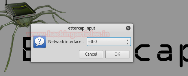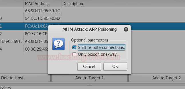 Click on MITM from the menu bar to select ARP Poisoning, a dialog box will pop-up now enable “sniff remote connects” and click OK.