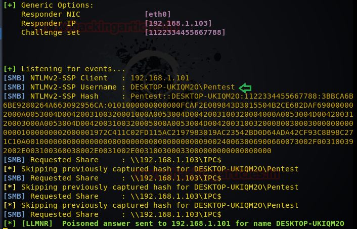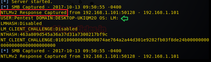 Once again the attacker had successfully captured NTMLv2 hash, from the given image you can see that here also the attacker has captured two things more: