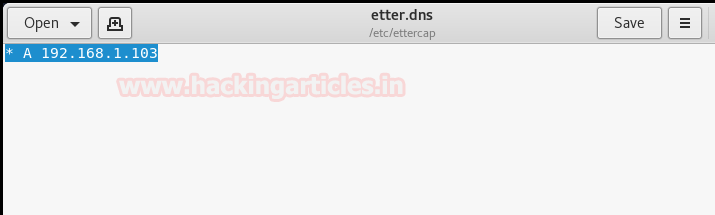 Being as attacker open etter.dns file from inside /etc/ettercap in your Kali Linux system then replace whole text by editing given below line includes attacker’s IP and save the text document.