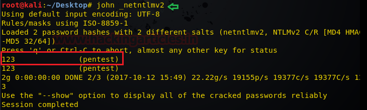 From given below image you can confirm we had successfully retrieved the password: 123 for user: pentest by cracking ntlmv2 hash.