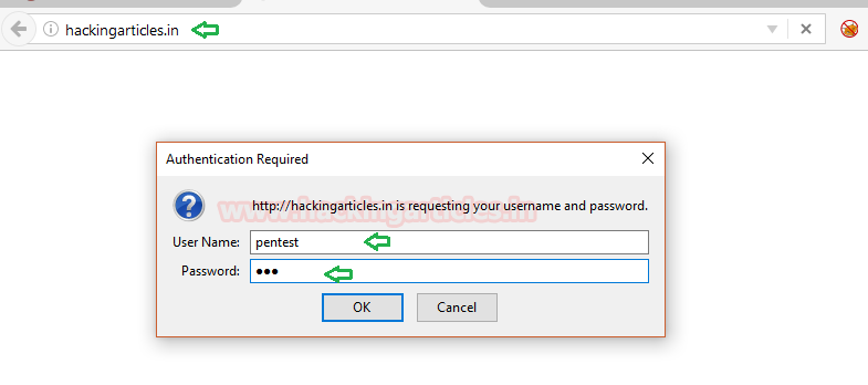 From given below image you can notice victim is trying to browse “hackingarticles.in” on his web browser but it requires authentication which is requesting for his username and password. Now if he tries to open something else let says google.com there also it will ask username and password for authentication until the victim will not submit his username and password he cannot browse anything on his web browser.