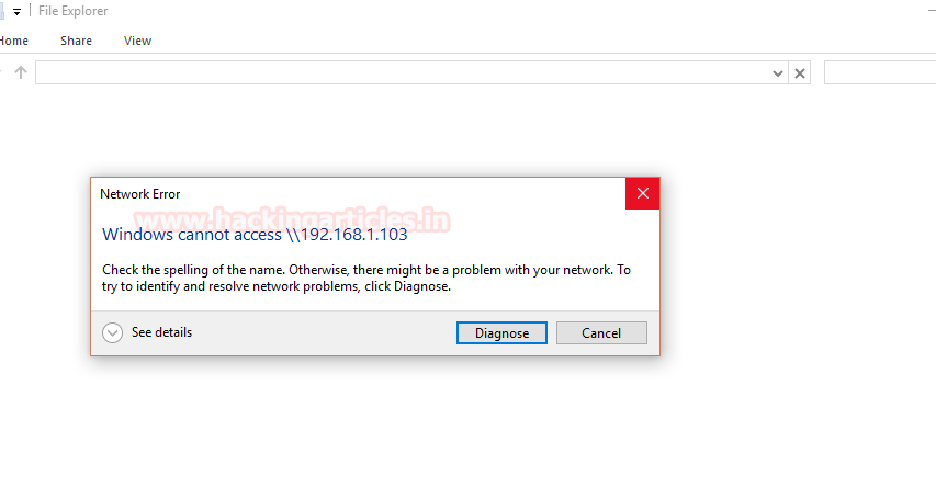 When the victim will try to access the shared folder, he will get trap into fake network error alert prompt, as shown in the given below image.