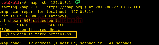 We had use nmap UDP and TCP port scanning command for identifying open ports and protocol and from the given image you can observe that port 137 is open for NetBIOS network service in our local machine.
