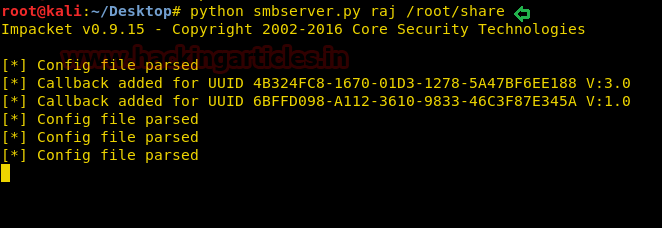 I copied the python code from GitHub and past it into a text file as smbserver.py in the desktop folder. Now execute give below command for a shared folder “raj”.
