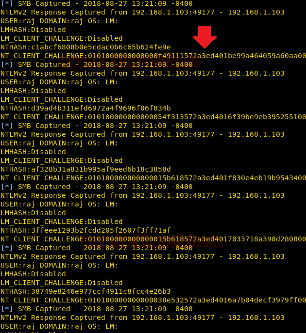 Awesome!! Once again the attacker had captured NTMLv2 hash, from the given image you can see that here also the attacker has captured: