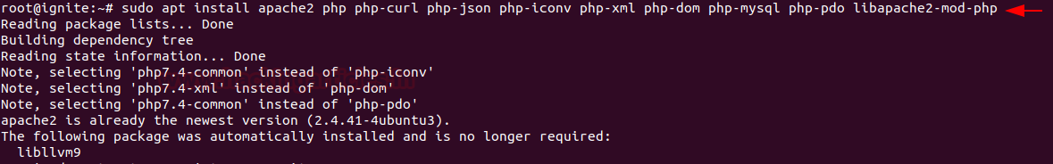 | 1 | sudo apt install apache2 php php-curl php-json php-iconv php-xml php-dom php-mysql php-pdo libapache2-mod-php |