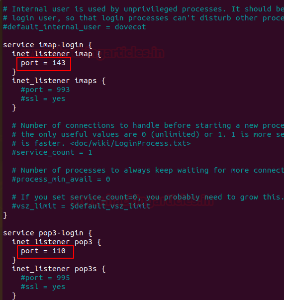 | 123 | sudo nano /etc/dovecot/conf.d/10-master.confport = 143port = 110 |