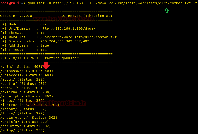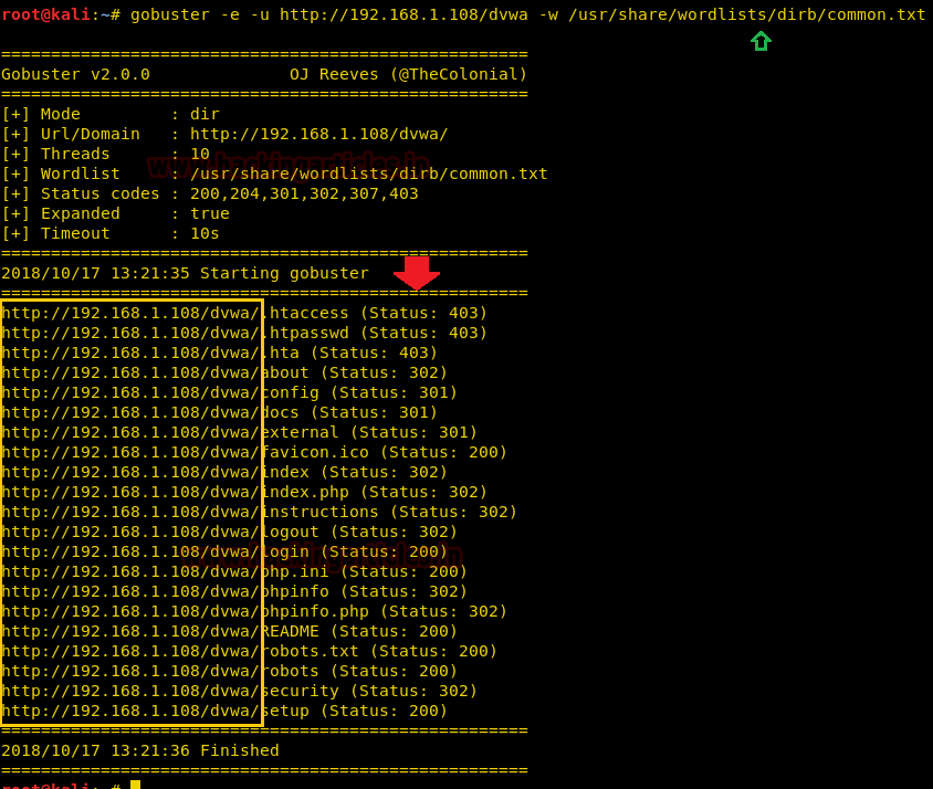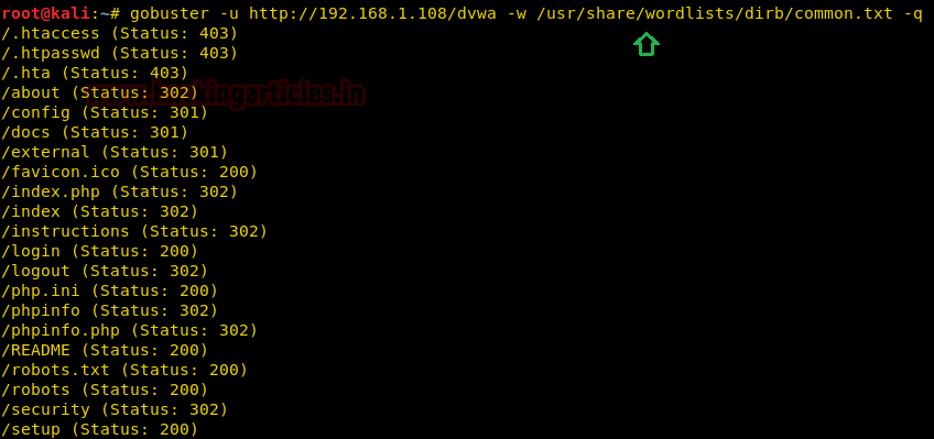 | 1 | gobuster -u http://192.168.1.108/dvwa -w /usr/share/wordlists/dirb/common.txt -v |