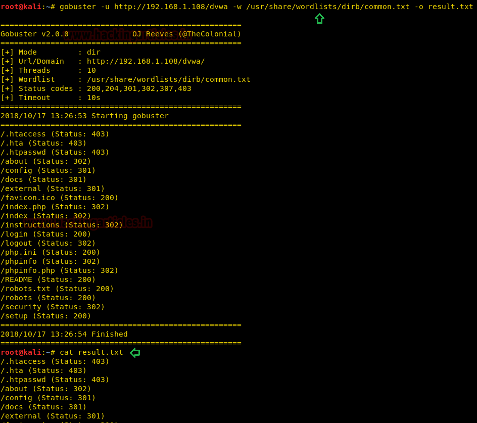 | 1 | gobuster -u http://192.168.1.108/dvwa -w /usr/share/wordlists/dirb/common.txt -o result.txt |