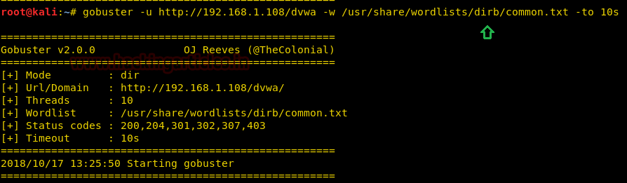 | 1 | gobuster -u http://192.168.1.108/dvwa -w /usr/share/wordlists/dirb/common.txt -to 10s |