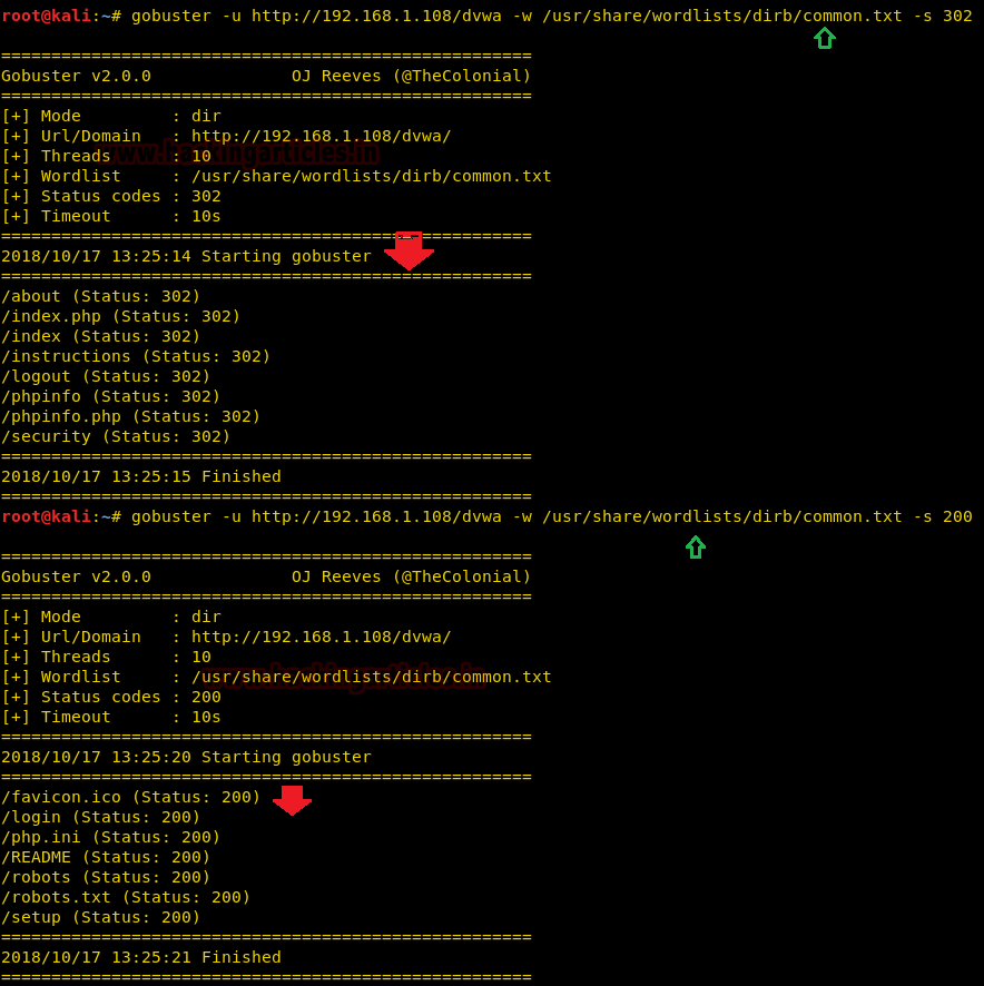 | 12 | gobuster -u http://192.168.1.108/dvwa -w /usr/share/wordlists/dirb/common.txt -s 302gobuster -u http://192.168.1.108/dvwa -w /usr/share/wordlists/dirb/common.txt -s 200 |