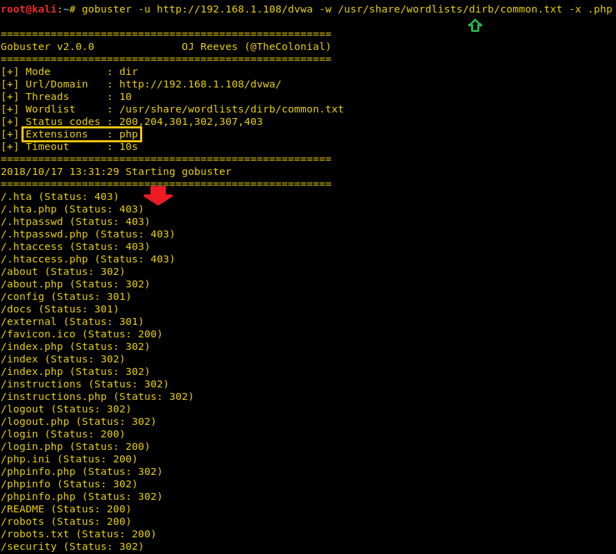 | 1 | gobuster -u http://192.168.1.108/dvwa -w /usr/share/wordlists/dirb/common.txt -x .php |