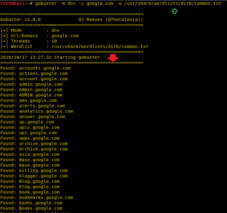| 1 | gobuster -m dns -u google.com -w /usr/share/wordlists/dirb/common.txt |