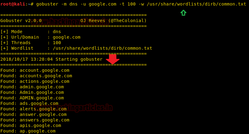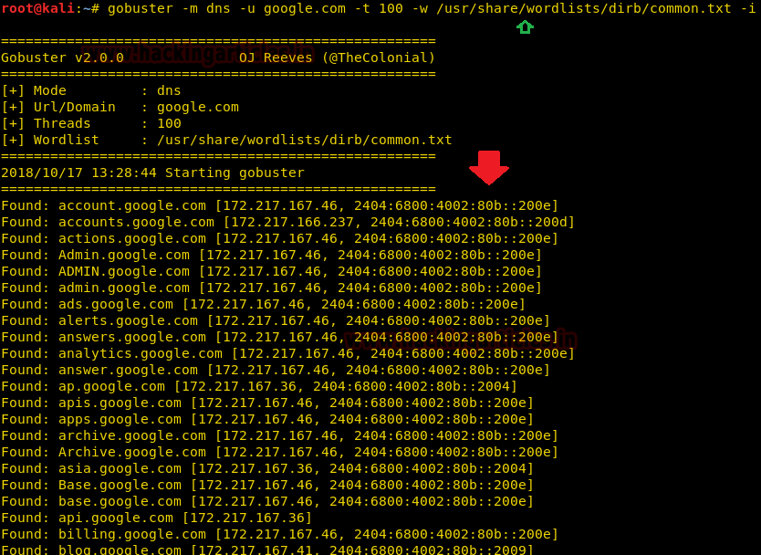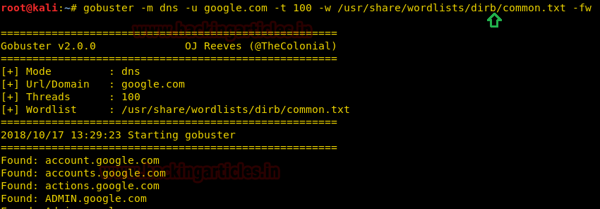 | 1 | gobuster -m dns -u google.com -t 100 -w /usr/share/wordlists/dirb/common.txt -i |