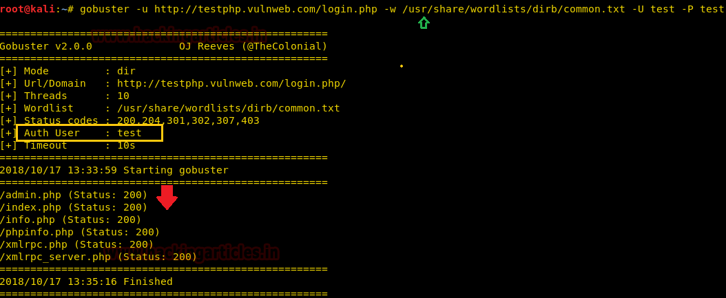 | 1 | gobuster -u http://testphp.vulnweb.com/login.php -w /usr/share/wordlists/dirb/common.txt -U test -P test |