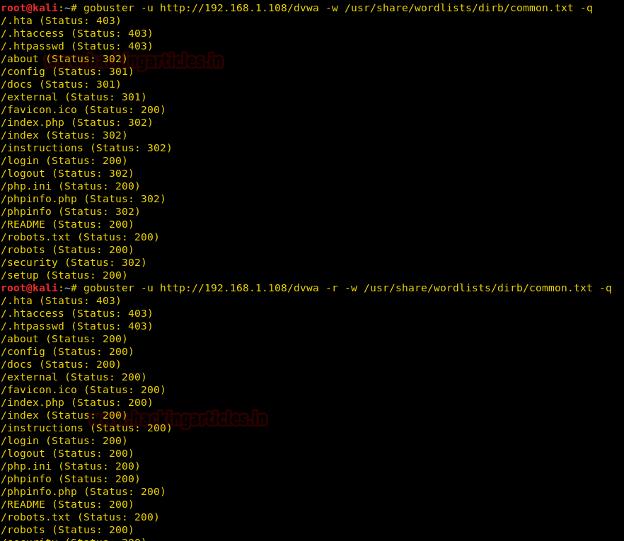 | 12 | gobuster -u http://192.168.1.108/dvwa -w /usr/share/wordlists/dirb/common.txt -qgobuster -u http://192.168.1.108/dvwa -r -w /usr/share/wordlists/dirb/common.txt -q |