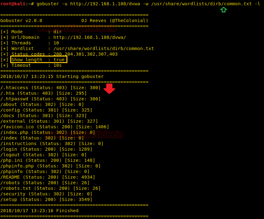 | 1 | gobuster -u http://192.168.1.108/dvwa -w /usr/share/wordlists/dirb/common.txt -l |