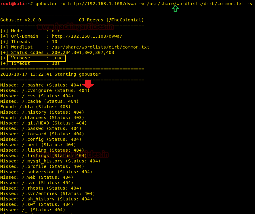 Using -v option – it enables the verbose parameter and makes brute-force attack vigorously on each file or directory.