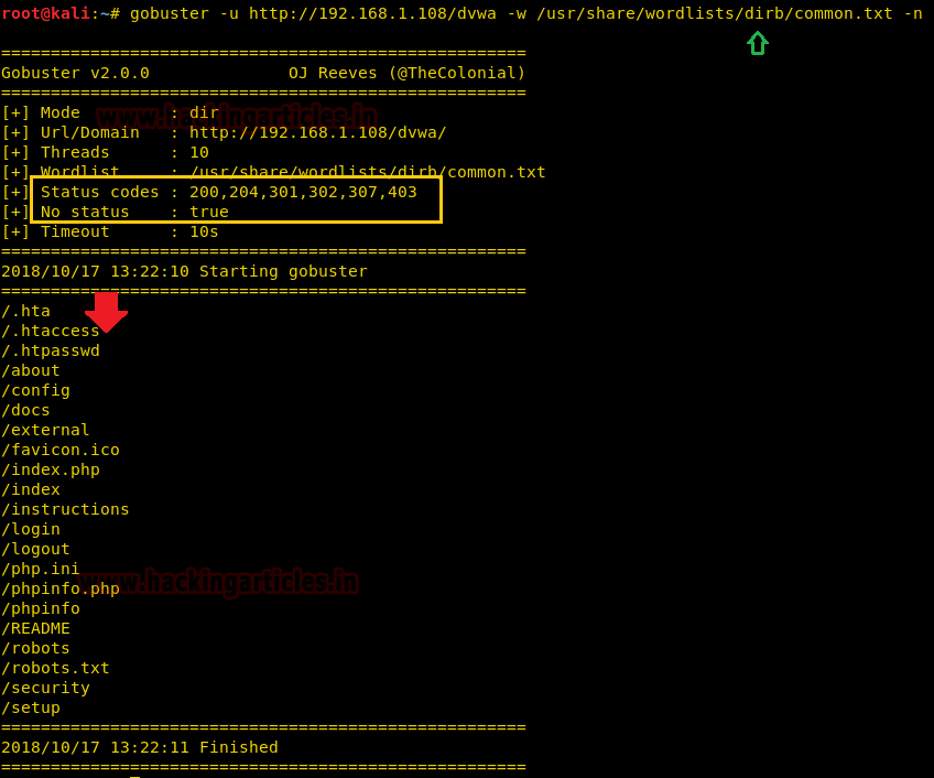 | 12 | gobuster -u http://192.168.1.108/dvwa -w /usr/share/wordlists/dirb/common.txt -s 302gobuster -u http://192.168.1.108/dvwa -w /usr/share/wordlists/dirb/common.txt -s 200 |