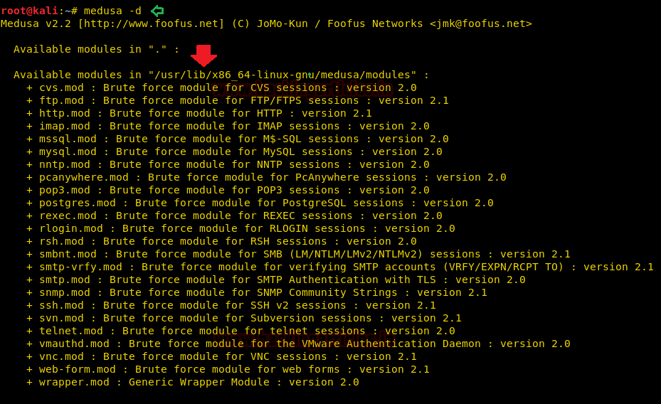 As said above medusa is a brute forcing tool and you can use -d option to identify all available modules it contains.